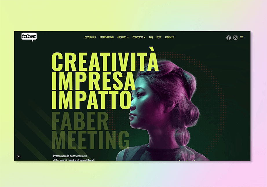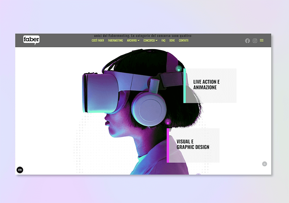 Dopo la pausa di 4 anni dalla precedente edizione, il concorso Faber necessitava di una nuova identità che mettesse il focus sull’aspetto digital della competizione. Le ambientazioni del sito hanno, quindi, un chiaro richiamo ad un mondo futuristico in cui, alla stregua di un film di fantascienza, i giovani creativi sono al vertice della società.