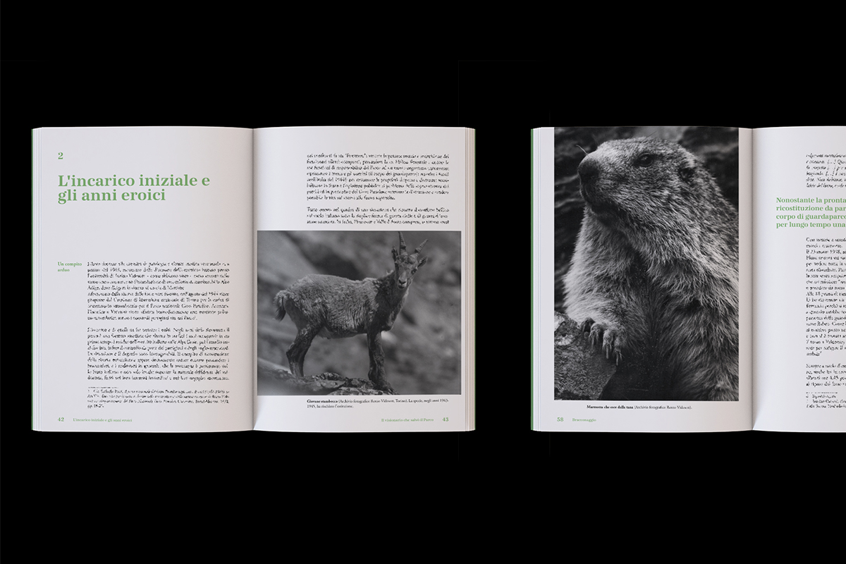 Essendo un archivio storico molte immagini sono in bianco e nero. Si è scelto di utilizzare un verde brillante per il forte contrasto che generava con questi colori oltre che per l’immediato riferimento alla natura. Questo colore guida il lettore, attirando l’attenzione su alcuni estratti più significativi oltre che sui singoli titoli del libro.